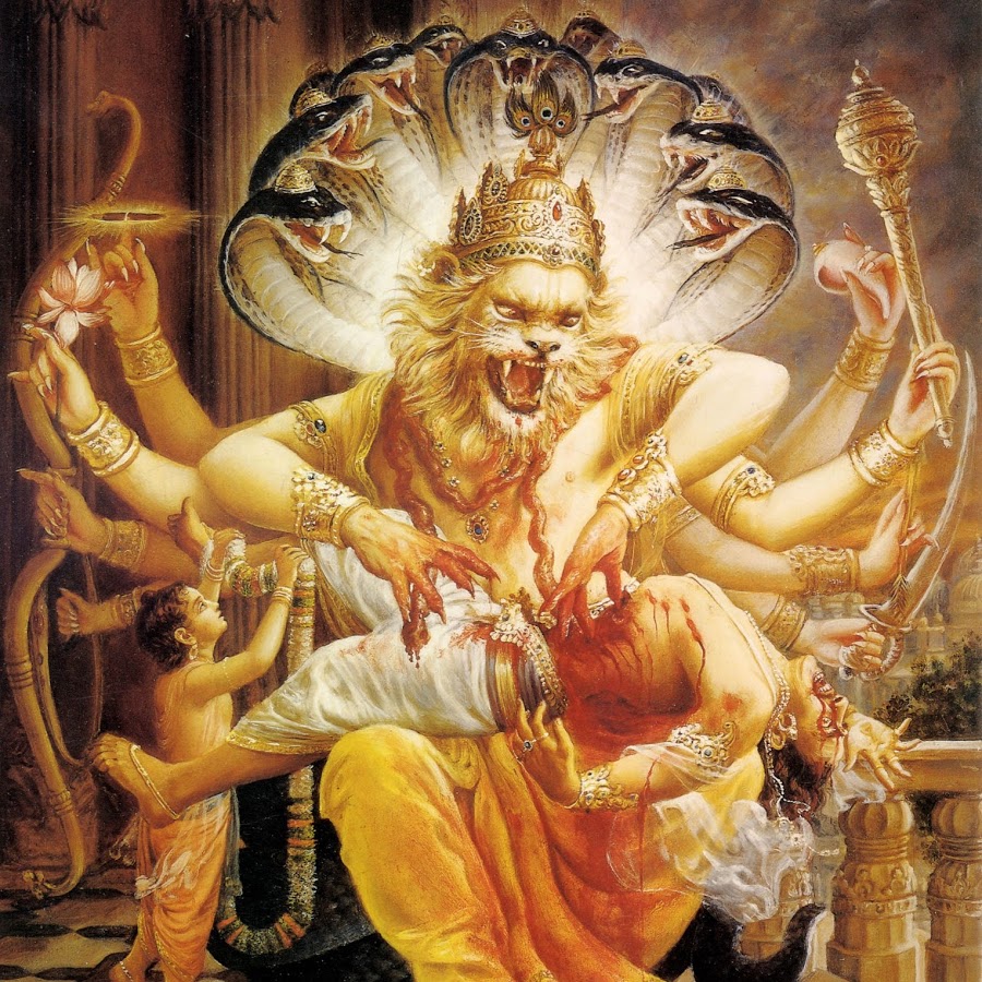 Я склоняюсь перед Господом Нарасимхой, который приносит радость Прахладе Махарадже и чьи ногти вонзаются, словно резцы, в каменную грудь демона Хираньякашипу.