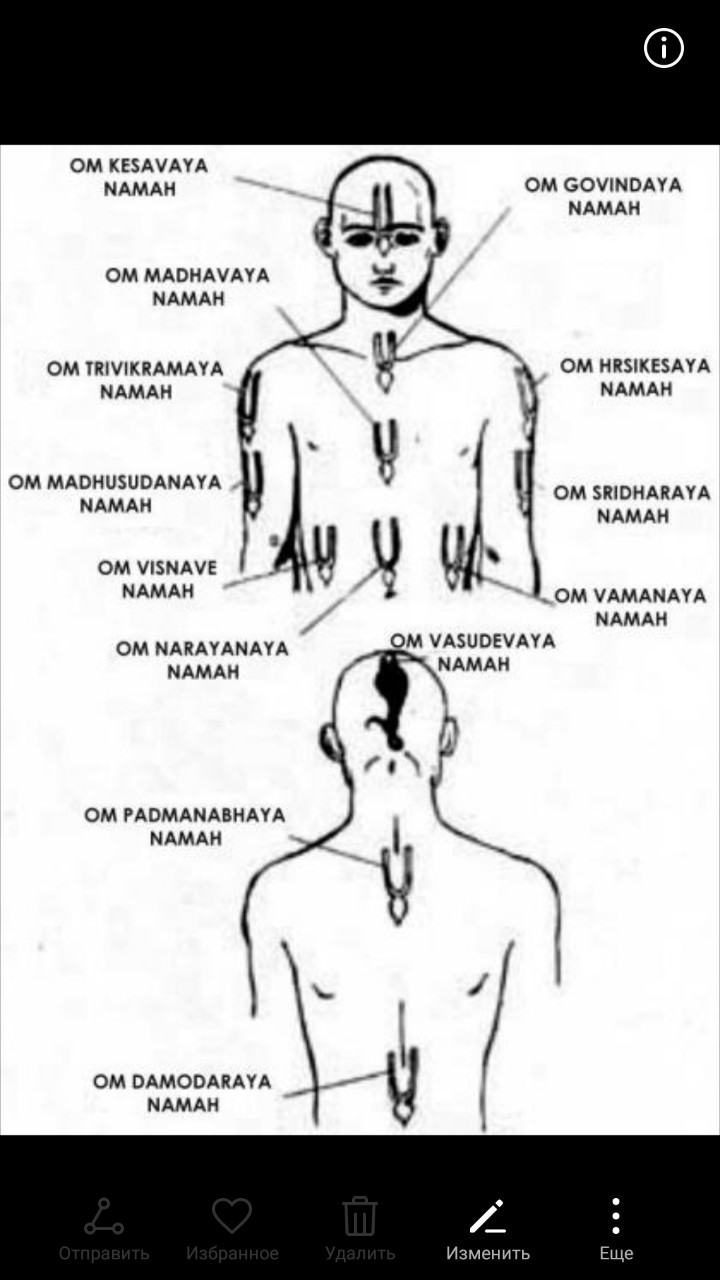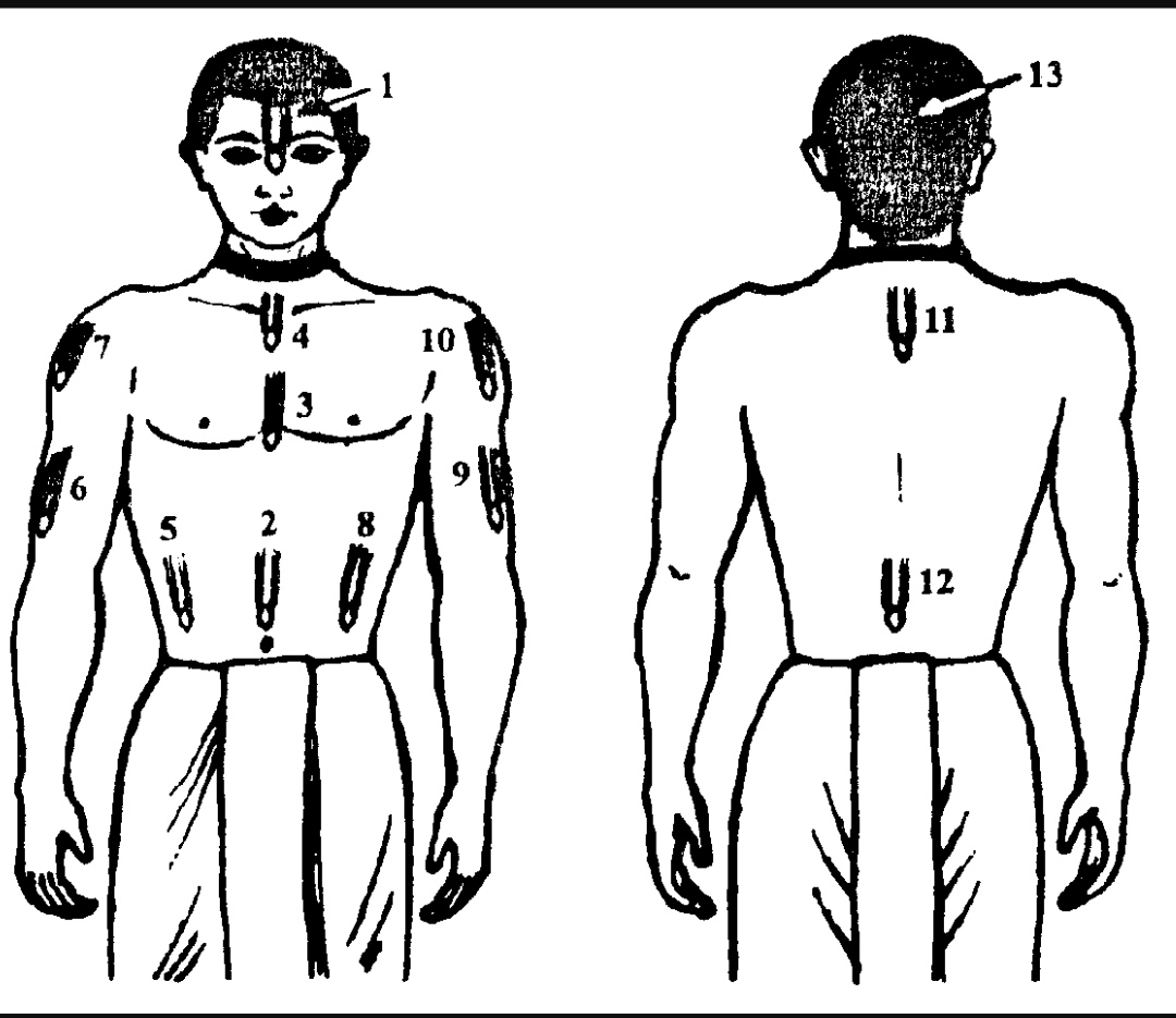 «Нанося тилаку на лоб, следует помнить Кешаву. Украшая тилакой среднюючасть живота, нужно памятовать о Нараяне. Отмечая тилакой грудь, помните о Мадхаве, ставя тилаку внизу шеи — Говинду. Помечать тилакой правую сторону живота следует, вспоминая Господа Вишну, а украшая тилакой правое предплечье, нужно медитировать на Мадхусудану. Ставя тилаку на правое плечо, необходимо помнить Тривикраму, а отмечая тилакой левую сторону живота, нужно памятовать о Вамане. Вспоминайте Шридхару, нанося тшаку на левое предплечье. Когда украшаете типакой левое плечо, помните Хришикешу. Помечая тилакой верхнюю и нижнюю часть спины, медитируйте на Падманабху и Дамодару» («Чайтанья-чаритамрита», Мадхьялила 20.202,комм.)."
